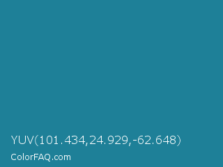 YUV 101.434,24.929,-62.648 Color is a normal cyan color and the nearest color is Jelly Bean #297b9a. Hex code #1e8098 and RGB value is rgb(30,128,152). In RGB color space, this color is composed of 12% red, 50% green, 60% blue, In CMYK color space, this color is composed of 80% cyan, 16% magenta, 0% yellow , 40% black , In HSL color space, this color has a hue angle of 192° , 67% saturation and 36% lightness.