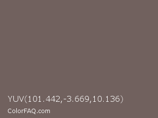 YUV 101.442,-3.669,10.136 Color is a normal red color and the nearest color is Scorpion #695f62. Hex code #71615e and RGB value is rgb(113,97,94). In RGB color space, this color is composed of 44% red, 38% green, 37% blue, In CMYK color space, this color is composed of 0% cyan, 14% magenta, 17% yellow , 56% black , In HSL color space, this color has a hue angle of 9° , 9% saturation and 41% lightness.