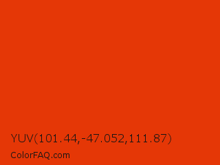 YUV 101.44,-47.052,111.87 Color is a normal red color and the nearest color is Grenadier #d54600. Hex code #e53706 and RGB value is rgb(229,55,6). In RGB color space, this color is composed of 90% red, 22% green, 2% blue, In CMYK color space, this color is composed of 0% cyan, 76% magenta, 97% yellow , 10% black , In HSL color space, this color has a hue angle of 13° , 95% saturation and 46% lightness.