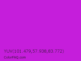 YUV 101.479,57.938,83.772 Color is a normal magenta color and the nearest color is Vivid Mulberry #b80ce3. Hex code #c51edb and RGB value is rgb(197,30,219). In RGB color space, this color is composed of 77% red, 12% green, 86% blue, In CMYK color space, this color is composed of 10% cyan, 86% magenta, 0% yellow , 14% black , In HSL color space, this color has a hue angle of 293° , 76% saturation and 49% lightness.