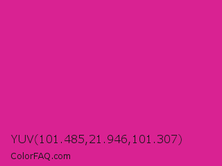 YUV 101.485,21.946,101.307 Color is a normal magenta color and the nearest color is Barbie Pink #e0218a. Hex code #d92292 and RGB value is rgb(217,34,146). In RGB color space, this color is composed of 85% red, 13% green, 57% blue, In CMYK color space, this color is composed of 0% cyan, 84% magenta, 33% yellow , 15% black , In HSL color space, this color has a hue angle of 323° , 73% saturation and 49% lightness.