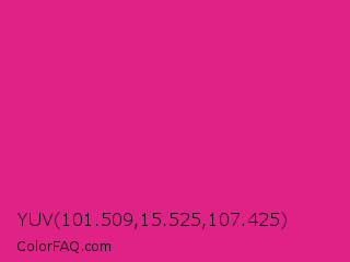 YUV 101.509,15.525,107.425 Color is a normal rose color and the nearest color is Barbie Pink #e0218a. Hex code #e02185 and RGB value is rgb(224,33,133). In RGB color space, this color is composed of 88% red, 13% green, 52% blue, In CMYK color space, this color is composed of 0% cyan, 85% magenta, 41% yellow , 12% black , In HSL color space, this color has a hue angle of 329° , 75% saturation and 50% lightness.