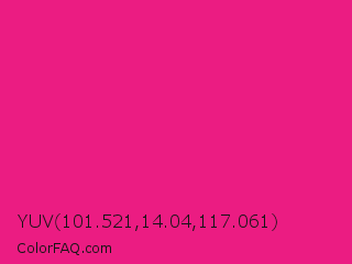 YUV 101.521,14.04,117.061 Color is a normal rose color and the nearest color is Barbie Pink #e0218a. Hex code #eb1c82 and RGB value is rgb(235,28,130). In RGB color space, this color is composed of 92% red, 11% green, 51% blue, In CMYK color space, this color is composed of 0% cyan, 88% magenta, 45% yellow , 8% black , In HSL color space, this color has a hue angle of 330° , 84% saturation and 52% lightness.