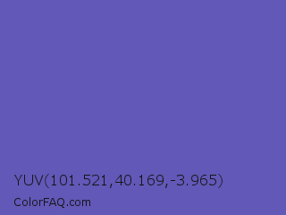 YUV 101.521,40.169,-3.965 Color is a normal indigo color and the nearest color is Blue Violet #6456b7. Hex code #6158b7 and RGB value is rgb(97,88,183). In RGB color space, this color is composed of 38% red, 35% green, 72% blue, In CMYK color space, this color is composed of 47% cyan, 52% magenta, 0% yellow , 28% black , In HSL color space, this color has a hue angle of 246° , 40% saturation and 53% lightness.