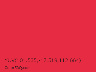 YUV 101.535,-17.519,112.664 Color is a normal red color and the nearest color is Imperial Red #ed2939. Hex code #e62b42 and RGB value is rgb(230,43,66). In RGB color space, this color is composed of 90% red, 17% green, 26% blue, In CMYK color space, this color is composed of 0% cyan, 81% magenta, 71% yellow , 10% black , In HSL color space, this color has a hue angle of 353° , 79% saturation and 54% lightness.