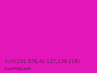 YUV 101.578,41.127,109.118 Color is a normal magenta color and the nearest color is Shocking Pink #fc0fc0. Hex code #e216b9 and RGB value is rgb(226,22,185). In RGB color space, this color is composed of 89% red, 9% green, 73% blue, In CMYK color space, this color is composed of 0% cyan, 90% magenta, 18% yellow , 11% black , In HSL color space, this color has a hue angle of 312° , 82% saturation and 49% lightness.