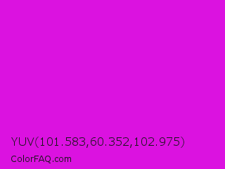YUV 101.583,60.352,102.975 Color is a normal magenta color and the nearest color is Deep Magenta #cc00cc. Hex code #db12e0 and RGB value is rgb(219,18,224). In RGB color space, this color is composed of 86% red, 7% green, 88% blue, In CMYK color space, this color is composed of 2% cyan, 92% magenta, 0% yellow , 12% black , In HSL color space, this color has a hue angle of 299° , 85% saturation and 47% lightness.