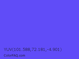 YUV 101.588,72.181,-4.901 Color is a light indigo color and the nearest color is Very Light Blue #6666ff. Hex code #604cf8 and RGB value is rgb(96,76,248). In RGB color space, this color is composed of 38% red, 30% green, 97% blue, In CMYK color space, this color is composed of 61% cyan, 69% magenta, 0% yellow , 3% black , In HSL color space, this color has a hue angle of 247° , 92% saturation and 64% lightness.