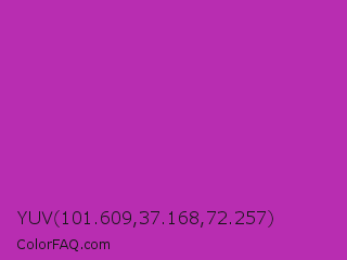 YUV 101.609,37.168,72.257 Color is a normal magenta color and the nearest color is Byzantine #bd33a4. Hex code #b82db1 and RGB value is rgb(184,45,177). In RGB color space, this color is composed of 72% red, 18% green, 69% blue, In CMYK color space, this color is composed of 0% cyan, 76% magenta, 4% yellow , 28% black , In HSL color space, this color has a hue angle of 303° , 61% saturation and 45% lightness.
