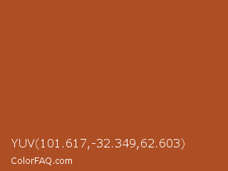 YUV 101.617,-32.349,62.603 Color is a normal orange color and the nearest color is Paarl #a65529. Hex code #ad4e24 and RGB value is rgb(173,78,36). In RGB color space, this color is composed of 68% red, 31% green, 14% blue, In CMYK color space, this color is composed of 0% cyan, 55% magenta, 79% yellow , 32% black , In HSL color space, this color has a hue angle of 18° , 66% saturation and 41% lightness.