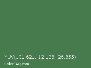 YUV 101.621,-12.138,-26.855 Color is a normal green color and the nearest color is Goblin #3d7d52. Hex code #477a4d and RGB value is rgb(71,122,77). In RGB color space, this color is composed of 28% red, 48% green, 30% blue, In CMYK color space, this color is composed of 42% cyan, 0% magenta, 37% yellow , 52% black , In HSL color space, this color has a hue angle of 127° , 26% saturation and 38% lightness.