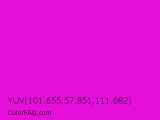 YUV 101.655,57.851,111.682 Color is a normal magenta color and the nearest color is Deep Magenta #cc00cc. Hex code #e50edb and RGB value is rgb(229,14,219). In RGB color space, this color is composed of 90% red, 5% green, 86% blue, In CMYK color space, this color is composed of 0% cyan, 94% magenta, 4% yellow , 10% black , In HSL color space, this color has a hue angle of 303° , 88% saturation and 48% lightness.