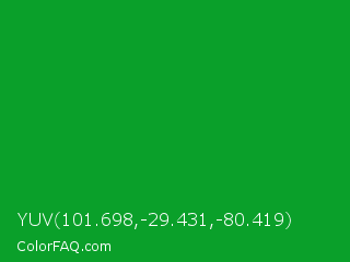 YUV 101.698,-29.431,-80.419 Color is a normal green color and the nearest color is North Texas Green #059033. Hex code #0aa02a and RGB value is rgb(10,160,42). In RGB color space, this color is composed of 4% red, 63% green, 16% blue, In CMYK color space, this color is composed of 94% cyan, 0% magenta, 74% yellow , 37% black , In HSL color space, this color has a hue angle of 133° , 88% saturation and 33% lightness.