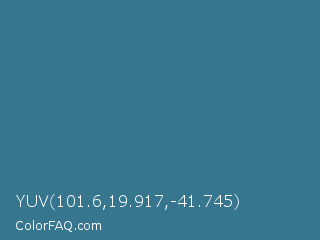 YUV 101.6,19.917,-41.745 Color is a normal blue color and the nearest color is Teal Blue #367588. Hex code #36768e and RGB value is rgb(54,118,142). In RGB color space, this color is composed of 21% red, 46% green, 56% blue, In CMYK color space, this color is composed of 62% cyan, 17% magenta, 0% yellow , 44% black , In HSL color space, this color has a hue angle of 196° , 45% saturation and 38% lightness.