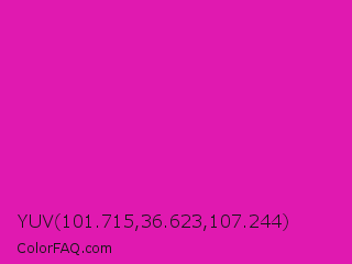 YUV 101.715,36.623,107.244 Color is a normal magenta color and the nearest color is Frostbite #e936a7. Hex code #e019b0 and RGB value is rgb(224,25,176). In RGB color space, this color is composed of 88% red, 10% green, 69% blue, In CMYK color space, this color is composed of 0% cyan, 89% magenta, 21% yellow , 12% black , In HSL color space, this color has a hue angle of 314° , 80% saturation and 49% lightness.