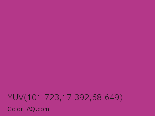 YUV 101.723,17.392,68.649 Color is a normal magenta color and the nearest color is Fandango #b53389. Hex code #b43789 and RGB value is rgb(180,55,137). In RGB color space, this color is composed of 71% red, 22% green, 54% blue, In CMYK color space, this color is composed of 0% cyan, 69% magenta, 24% yellow , 29% black , In HSL color space, this color has a hue angle of 321° , 53% saturation and 46% lightness.
