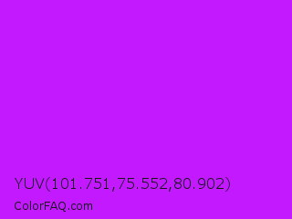YUV 101.751,75.552,80.902 Color is a normal purple color and the nearest color is Electric Purple #bf00ff. Hex code #c219ff and RGB value is rgb(194,25,255). In RGB color space, this color is composed of 76% red, 10% green, 100% blue, In CMYK color space, this color is composed of 24% cyan, 90% magenta, 0% yellow , 0% black , In HSL color space, this color has a hue angle of 284° , 100% saturation and 55% lightness.