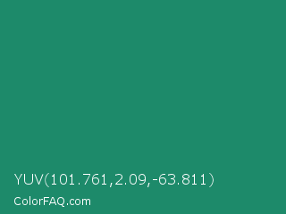 YUV 101.761,2.09,-63.811 Color is a normal green color and the nearest color is Eucalyptus #278a5b. Hex code #1d8a6a and RGB value is rgb(29,138,106). In RGB color space, this color is composed of 11% red, 54% green, 42% blue, In CMYK color space, this color is composed of 79% cyan, 0% magenta, 23% yellow , 46% black , In HSL color space, this color has a hue angle of 162° , 65% saturation and 33% lightness.
