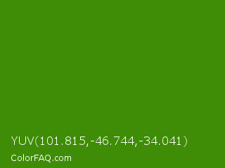 YUV 101.815,-46.744,-34.041 Color is a dark green color and the nearest color is La Palma #368716. Hex code #3f8c07 and RGB value is rgb(63,140,7). In RGB color space, this color is composed of 25% red, 55% green, 3% blue, In CMYK color space, this color is composed of 55% cyan, 0% magenta, 95% yellow , 45% black , In HSL color space, this color has a hue angle of 95° , 90% saturation and 29% lightness.