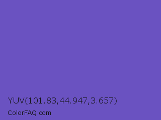 YUV 101.83,44.947,3.657 Color is a normal indigo color and the nearest color is Blue Violet #6456b7. Hex code #6a52c1 and RGB value is rgb(106,82,193). In RGB color space, this color is composed of 42% red, 32% green, 76% blue, In CMYK color space, this color is composed of 45% cyan, 58% magenta, 0% yellow , 24% black , In HSL color space, this color has a hue angle of 253° , 47% saturation and 54% lightness.