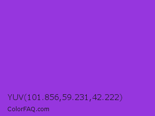 YUV 101.856,59.231,42.222 Color is a normal purple color and the nearest color is Blue Violet #8a2be2. Hex code #9636de and RGB value is rgb(150,54,222). In RGB color space, this color is composed of 59% red, 21% green, 87% blue, In CMYK color space, this color is composed of 32% cyan, 76% magenta, 0% yellow , 13% black , In HSL color space, this color has a hue angle of 274° , 72% saturation and 54% lightness.