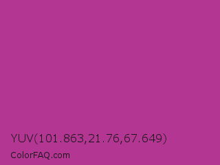 YUV 101.863,21.76,67.649 Color is a normal magenta color and the nearest color is Fandango #b53389. Hex code #b33692 and RGB value is rgb(179,54,146). In RGB color space, this color is composed of 70% red, 21% green, 57% blue, In CMYK color space, this color is composed of 0% cyan, 70% magenta, 18% yellow , 30% black , In HSL color space, this color has a hue angle of 316° , 54% saturation and 46% lightness.