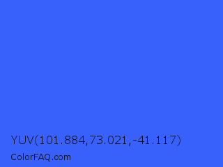 YUV 101.884,73.021,-41.117 Color is a normal blue color and the nearest color is Ultramarine Blue #4166f5. Hex code #3761fa and RGB value is rgb(55,97,250). In RGB color space, this color is composed of 22% red, 38% green, 98% blue, In CMYK color space, this color is composed of 78% cyan, 61% magenta, 0% yellow , 2% black , In HSL color space, this color has a hue angle of 227° , 95% saturation and 60% lightness.