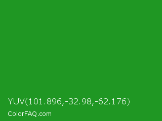 YUV 101.896,-32.98,-62.176 Color is a normal green color and the nearest color is Forest Green #228b22. Hex code #1f9723 and RGB value is rgb(31,151,35). In RGB color space, this color is composed of 12% red, 59% green, 14% blue, In CMYK color space, this color is composed of 79% cyan, 0% magenta, 77% yellow , 41% black , In HSL color space, this color has a hue angle of 122° , 66% saturation and 36% lightness.