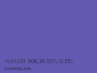 YUV 101.908,36.527,-2.55 Color is a normal indigo color and the nearest color is Blue Violet #6456b7. Hex code #6359b0 and RGB value is rgb(99,89,176). In RGB color space, this color is composed of 39% red, 35% green, 69% blue, In CMYK color space, this color is composed of 44% cyan, 49% magenta, 0% yellow , 31% black , In HSL color space, this color has a hue angle of 247° , 36% saturation and 52% lightness.