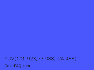 YUV 101.923,73.988,-24.488 Color is a light blue color and the nearest color is Ultramarine Blue #4166f5. Hex code #4a57fc and RGB value is rgb(74,87,252). In RGB color space, this color is composed of 29% red, 34% green, 99% blue, In CMYK color space, this color is composed of 71% cyan, 65% magenta, 0% yellow , 1% black , In HSL color space, this color has a hue angle of 236° , 97% saturation and 64% lightness.