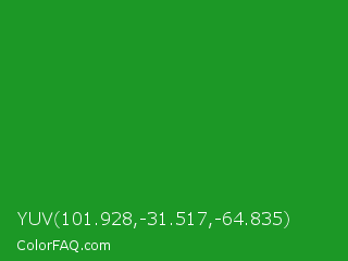 YUV 101.928,-31.517,-64.835 Color is a normal green color and the nearest color is Forest Green #228b22. Hex code #1c9826 and RGB value is rgb(28,152,38). In RGB color space, this color is composed of 11% red, 60% green, 15% blue, In CMYK color space, this color is composed of 82% cyan, 0% magenta, 75% yellow , 40% black , In HSL color space, this color has a hue angle of 125° , 69% saturation and 35% lightness.