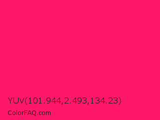 YUV 101.944,2.493,134.23 Color is a normal rose color and the nearest color is Vivid Raspberry #ff006c. Hex code #ff176b and RGB value is rgb(255,23,107). In RGB color space, this color is composed of 100% red, 9% green, 42% blue, In CMYK color space, this color is composed of 0% cyan, 91% magenta, 58% yellow , 0% black , In HSL color space, this color has a hue angle of 338° , 100% saturation and 55% lightness.