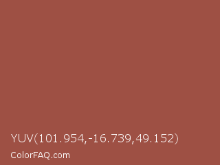 YUV 101.954,-16.739,49.152 Color is a normal red color and the nearest color is Sepia Skin #9e5b40. Hex code #9e5044 and RGB value is rgb(158,80,68). In RGB color space, this color is composed of 62% red, 31% green, 27% blue, In CMYK color space, this color is composed of 0% cyan, 49% magenta, 57% yellow , 38% black , In HSL color space, this color has a hue angle of 8° , 40% saturation and 44% lightness.
