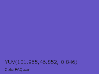 YUV 101.965,46.852,-0.846 Color is a normal indigo color and the nearest color is Slate Blue #6a5acd. Hex code #6554c5 and RGB value is rgb(101,84,197). In RGB color space, this color is composed of 40% red, 33% green, 77% blue, In CMYK color space, this color is composed of 49% cyan, 57% magenta, 0% yellow , 23% black , In HSL color space, this color has a hue angle of 249° , 49% saturation and 55% lightness.