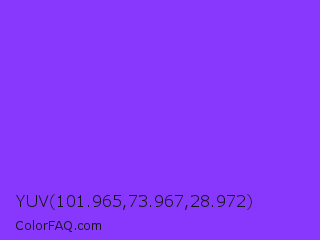 YUV 101.965,73.967,28.972 Color is a normal violet color and the nearest color is Blue Violet #8a2be2. Hex code #8738fc and RGB value is rgb(135,56,252). In RGB color space, this color is composed of 53% red, 22% green, 99% blue, In CMYK color space, this color is composed of 46% cyan, 78% magenta, 0% yellow , 1% black , In HSL color space, this color has a hue angle of 264° , 97% saturation and 60% lightness.