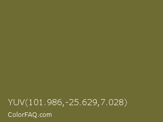 YUV 101.986,-25.629,7.028 Color is a normal yellow color and the nearest color is Yellow Metal #716338. Hex code #6e6c32 and RGB value is rgb(110,108,50). In RGB color space, this color is composed of 43% red, 42% green, 20% blue, In CMYK color space, this color is composed of 0% cyan, 2% magenta, 55% yellow , 57% black , In HSL color space, this color has a hue angle of 58° , 38% saturation and 31% lightness.