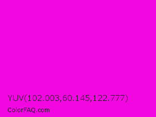 YUV 102.003,60.145,122.777 Color is a normal magenta color and the nearest color is Purple Pizzazz #ff00cc. Hex code #f207e0 and RGB value is rgb(242,7,224). In RGB color space, this color is composed of 95% red, 3% green, 88% blue, In CMYK color space, this color is composed of 0% cyan, 97% magenta, 7% yellow , 5% black , In HSL color space, this color has a hue angle of 305° , 94% saturation and 49% lightness.