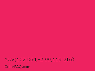 YUV 102.064,-2.99,119.216 Color is a normal rose color and the nearest color is Razzmatazz #e3256b. Hex code #ee2260 and RGB value is rgb(238,34,96). In RGB color space, this color is composed of 93% red, 13% green, 38% blue, In CMYK color space, this color is composed of 0% cyan, 86% magenta, 60% yellow , 7% black , In HSL color space, this color has a hue angle of 342° , 86% saturation and 53% lightness.