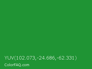YUV 102.073,-24.686,-62.331 Color is a normal green color and the nearest color is Forest Green #228b22. Hex code #1f9434 and RGB value is rgb(31,148,52). In RGB color space, this color is composed of 12% red, 58% green, 20% blue, In CMYK color space, this color is composed of 79% cyan, 0% magenta, 65% yellow , 42% black , In HSL color space, this color has a hue angle of 131° , 65% saturation and 35% lightness.