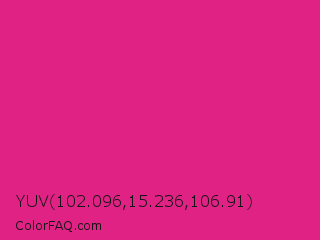 YUV 102.096,15.236,106.91 Color is a normal rose color and the nearest color is Barbie Pink #e0218a. Hex code #e02285 and RGB value is rgb(224,34,133). In RGB color space, this color is composed of 88% red, 13% green, 52% blue, In CMYK color space, this color is composed of 0% cyan, 85% magenta, 41% yellow , 12% black , In HSL color space, this color has a hue angle of 329° , 75% saturation and 51% lightness.