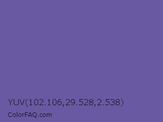YUV 102.106,29.528,2.538 Color is a normal indigo color and the nearest color is Scampi #675fa6. Hex code #6959a2 and RGB value is rgb(105,89,162). In RGB color space, this color is composed of 41% red, 35% green, 64% blue, In CMYK color space, this color is composed of 35% cyan, 45% magenta, 0% yellow , 36% black , In HSL color space, this color has a hue angle of 253° , 29% saturation and 49% lightness.