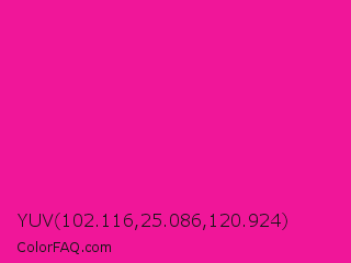YUV 102.116,25.086,120.924 Color is a normal magenta color and the nearest color is Fluorescent Pink #ff1493. Hex code #f01699 and RGB value is rgb(240,22,153). In RGB color space, this color is composed of 94% red, 9% green, 60% blue, In CMYK color space, this color is composed of 0% cyan, 91% magenta, 36% yellow , 6% black , In HSL color space, this color has a hue angle of 324° , 88% saturation and 51% lightness.