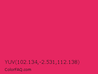 YUV 102.134,-2.531,112.138 Color is a normal rose color and the nearest color is Razzmatazz #e3256b. Hex code #e62661 and RGB value is rgb(230,38,97). In RGB color space, this color is composed of 90% red, 15% green, 38% blue, In CMYK color space, this color is composed of 0% cyan, 83% magenta, 58% yellow , 10% black , In HSL color space, this color has a hue angle of 342° , 79% saturation and 53% lightness.