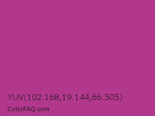 YUV 102.168,19.144,66.505 Color is a normal magenta color and the nearest color is Fandango #b53389. Hex code #b2388d and RGB value is rgb(178,56,141). In RGB color space, this color is composed of 70% red, 22% green, 55% blue, In CMYK color space, this color is composed of 0% cyan, 69% magenta, 21% yellow , 30% black , In HSL color space, this color has a hue angle of 318° , 52% saturation and 46% lightness.