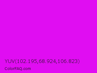 YUV 102.195,68.924,106.823 Color is a normal magenta color and the nearest color is Phlox #df00ff. Hex code #e00df2 and RGB value is rgb(224,13,242). In RGB color space, this color is composed of 88% red, 5% green, 95% blue, In CMYK color space, this color is composed of 7% cyan, 95% magenta, 0% yellow , 5% black , In HSL color space, this color has a hue angle of 295° , 90% saturation and 50% lightness.