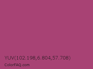YUV 102.198,6.804,57.708 Color is a normal rose color and the nearest color is Mystic Maroon #ad4379. Hex code #a84274 and RGB value is rgb(168,66,116). In RGB color space, this color is composed of 66% red, 26% green, 45% blue, In CMYK color space, this color is composed of 0% cyan, 61% magenta, 31% yellow , 34% black , In HSL color space, this color has a hue angle of 331° , 44% saturation and 46% lightness.