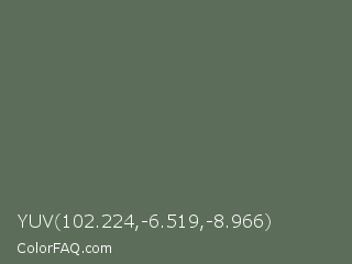 YUV 102.224,-6.519,-8.966 Color is a normal green color and the nearest color is Cactus #587156. Hex code #5c6e59 and RGB value is rgb(92,110,89). In RGB color space, this color is composed of 36% red, 43% green, 35% blue, In CMYK color space, this color is composed of 16% cyan, 0% magenta, 19% yellow , 57% black , In HSL color space, this color has a hue angle of 111° , 11% saturation and 39% lightness.