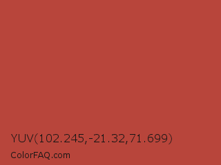 YUV 102.245,-21.32,71.699 Color is a normal red color and the nearest color is Mojo #c04737. Hex code #b8453b and RGB value is rgb(184,69,59). In RGB color space, this color is composed of 72% red, 27% green, 23% blue, In CMYK color space, this color is composed of 0% cyan, 63% magenta, 68% yellow , 28% black , In HSL color space, this color has a hue angle of 5° , 51% saturation and 48% lightness.