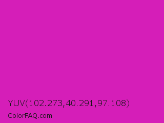 YUV 102.273,40.291,97.108 Color is a normal magenta color and the nearest color is Steel Pink #cc33cc. Hex code #d51eb8 and RGB value is rgb(213,30,184). In RGB color space, this color is composed of 84% red, 12% green, 72% blue, In CMYK color space, this color is composed of 0% cyan, 86% magenta, 14% yellow , 16% black , In HSL color space, this color has a hue angle of 310° , 75% saturation and 48% lightness.