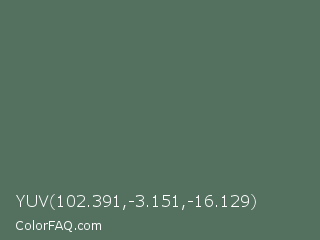 YUV 102.391,-3.151,-16.129 Color is a normal green color and the nearest color is Cactus #587156. Hex code #547160 and RGB value is rgb(84,113,96). In RGB color space, this color is composed of 33% red, 44% green, 38% blue, In CMYK color space, this color is composed of 26% cyan, 0% magenta, 15% yellow , 56% black , In HSL color space, this color has a hue angle of 145° , 15% saturation and 39% lightness.